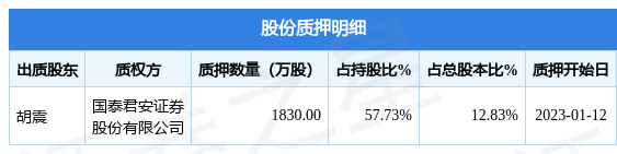 振江股份(603507)1月13日公开信息显示,股东胡震向国泰君安(601211)证券股份有限公司合计质押1830.0万股,占总股本12.83%。质押详情见下表: