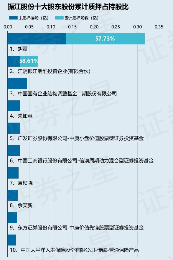 截止本公告日,股东胡震已累计质押股份1830.0万股,占其持股总数的57.73%,股东江阴振江朗维投资企业(有限合伙)已累计质押股份408.2万股,占其持股总数的58.61%。本次质押后振江股份(603507)十大股东的累计质押股份占持股比例见下图: